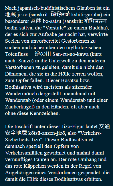 Dieser Jizō soll die verwirrten Seelen von Verkehrsopfern über den Totenfluss geleiten