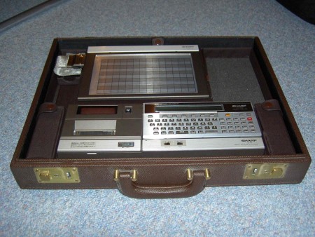 (Der Spezialkoffer Sharp CE-154, hier mit PC-1500A + CE-150 + CE-153, das Fach rechts hinten für die "Datasette" Sharp CE-152 ist gerade leer.)