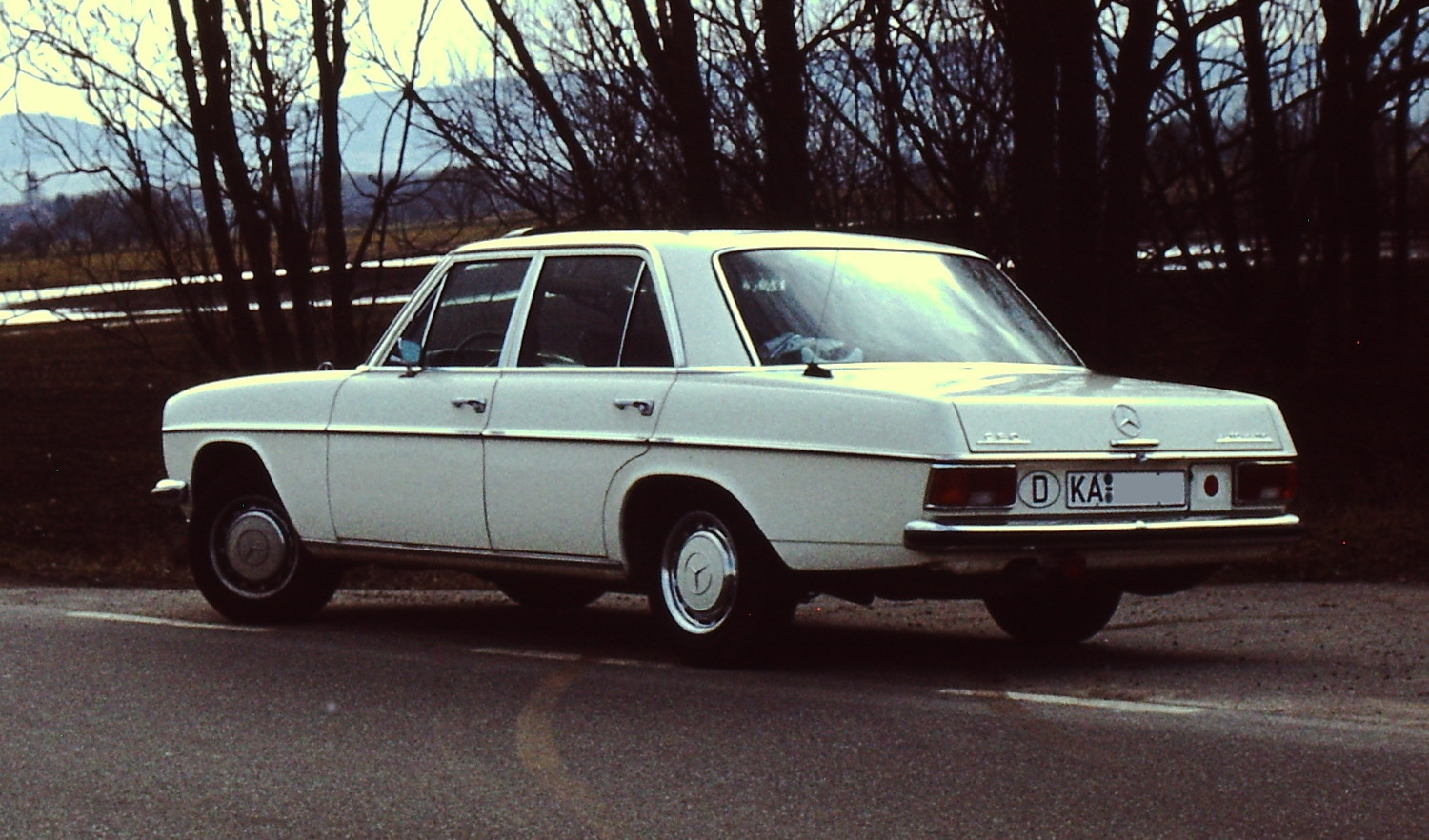 ![]() ![]() Unser Mercedes 230 Automatik (Modell W114, "/8") von 1968, von hinten Damals war das D-Schild noch vorgeschrieben, und symmetrisch dazu haben wir dann auch die Japan-Flagge angeklebt. |