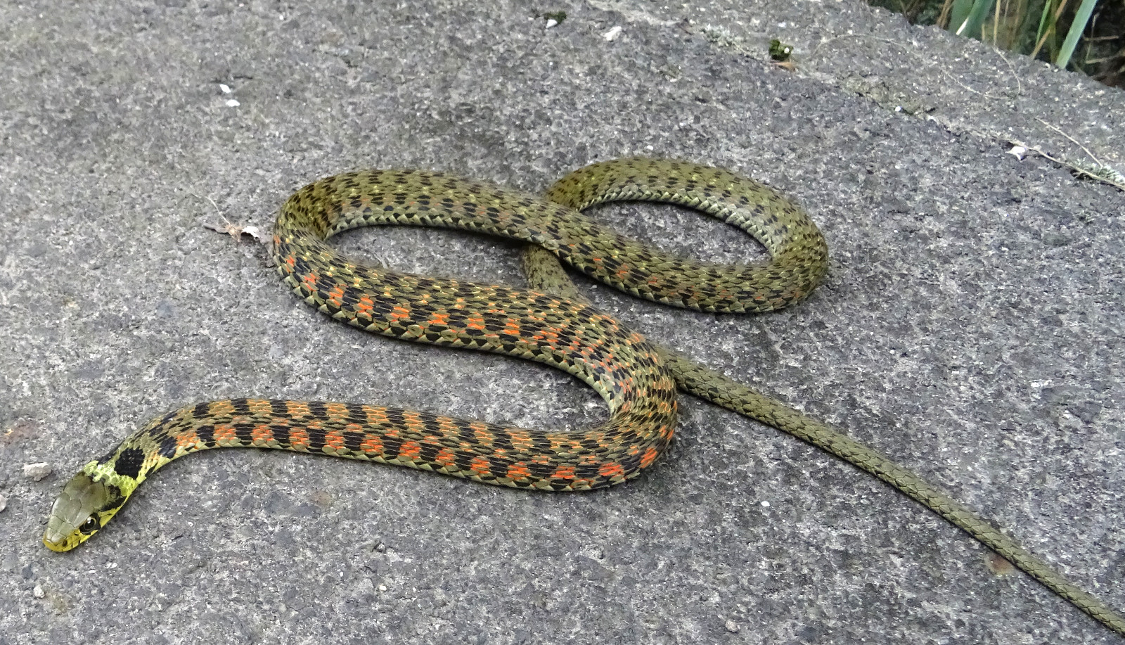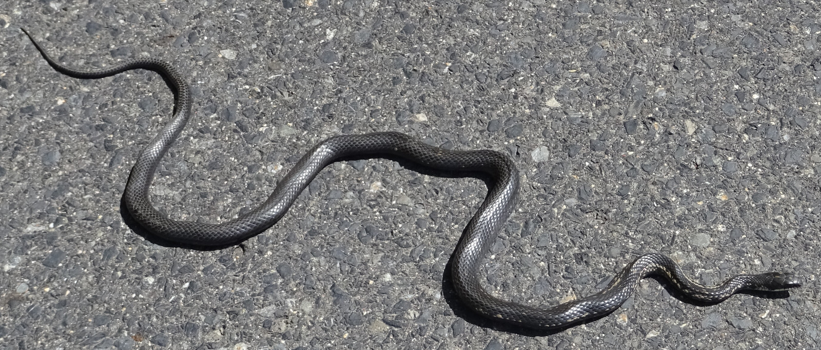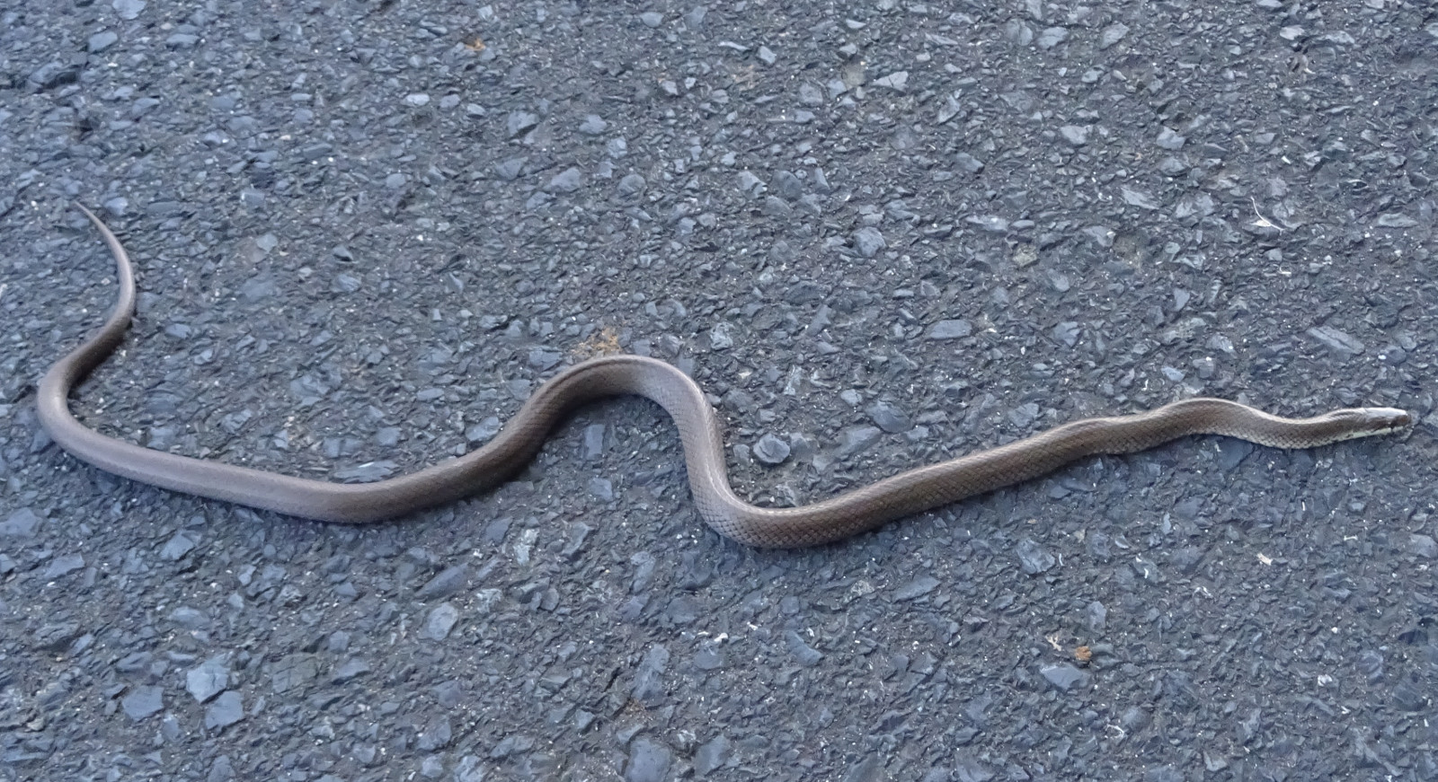 wie hier zu sehen ist. Die Länge dieser Schlange betrug etwa 150 cm, aufgenommen habe ich sie im Mai 2021. Es handelt sich hier um die dunkle Varietät derselben Spezies Elaphe quadrivirgata wie im Foto oben. Auf japanisch wird diese wegen ihrer Färbung "Karasuhebi" genannt ("karasu" = Krähe, "hebi" = Schlange).