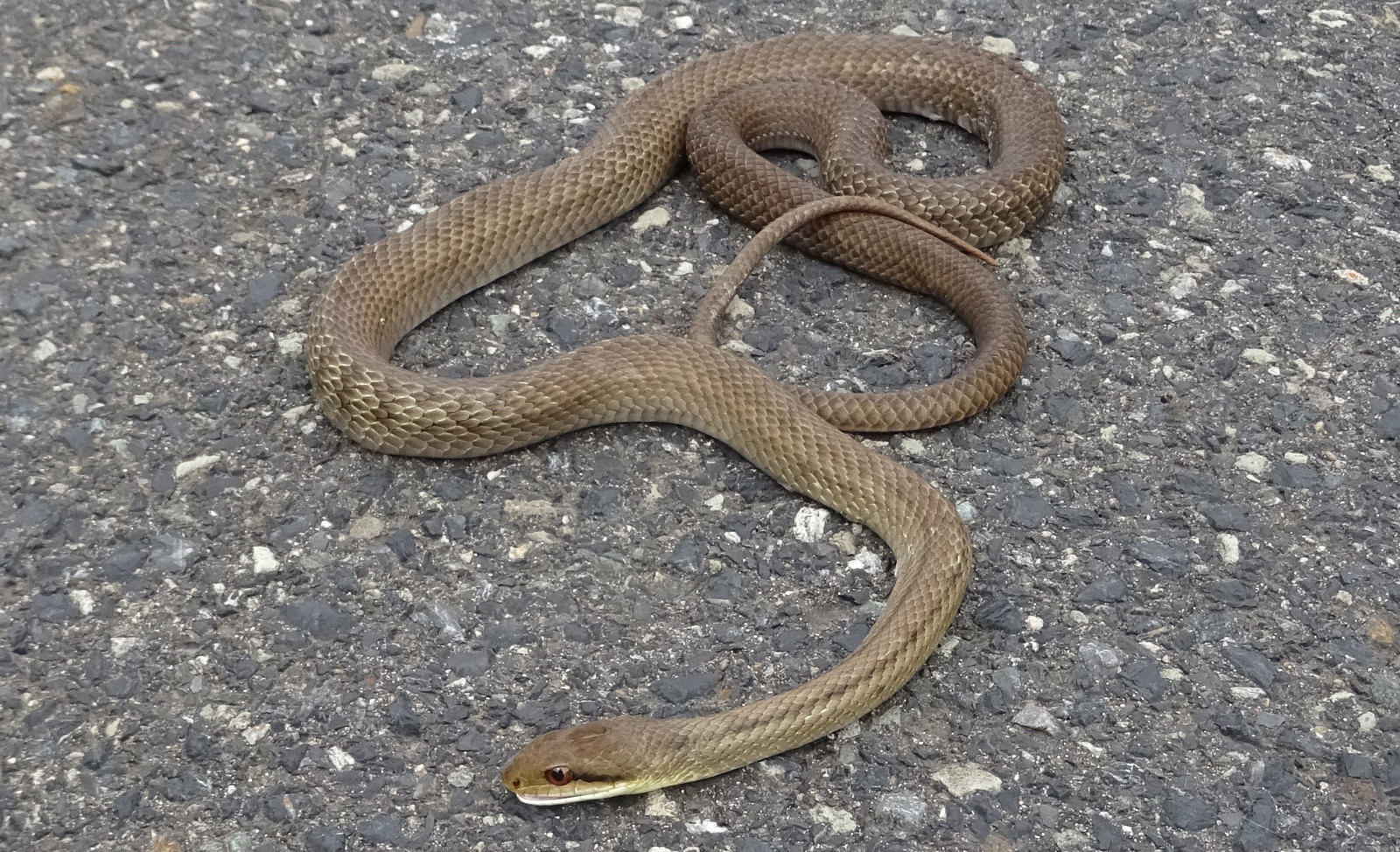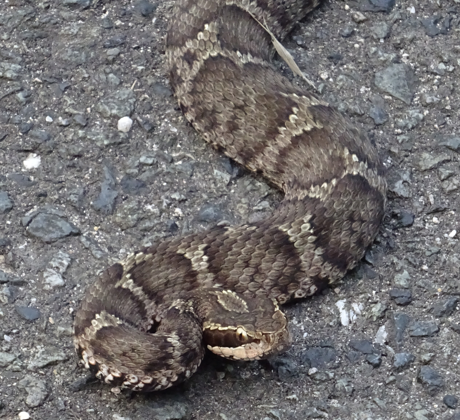 Auf der Bauchseite ist die Schlange ziemlich hell, aber die auf diesem Foto weiß aussehenden Schuppen am Rücken waren ebenso dunkelbraun wie die hier dunkel aussehenden, haben aber in der Sonne geglänzt. |