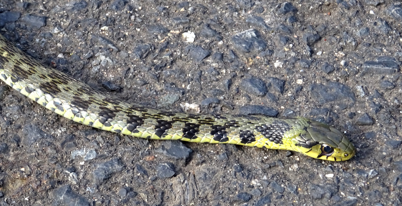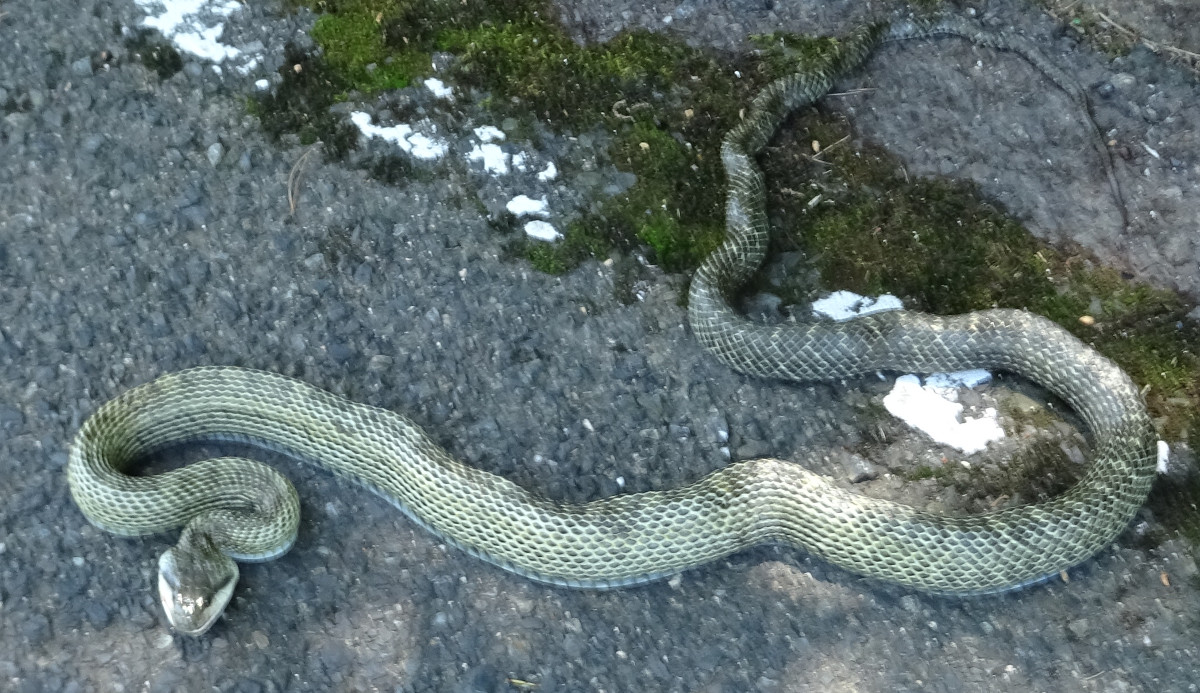 Wie man an meinen Fotos sieht, sind es fast immer asphaltierte Wege, auf denen mir Schlangen in Japan begegnen, da ich dort viel unterwegs bin. Leider stellen sich viele Schlangen tot, wenn sich Menschen (oder Autos) nähern und bleiben womöglich mitten auf der Straße liegen, um dann prompt überfahren zu werden. Dieses Exemplar habe ich jedenfalls retten können, indem ich neben seinem Schwanzende mehrmals drohend auf den Boden gestampft habe, so dass sich die Schlange zur Flucht nach vorne entschloss und so unversehrt den rettenden Straßengraben erreichte. |