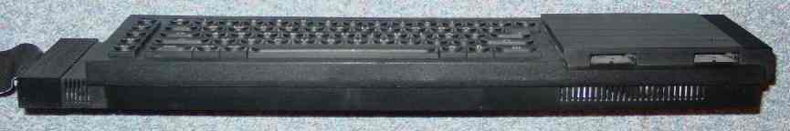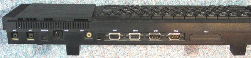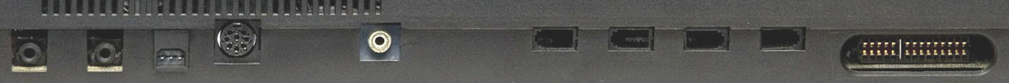 ![]() Alle QL-Modelle enthalten standardmäßig zwei integrierte Sinclair-spezifische "Microdrive"-Laufwerke, deren Öffnungen rechts erkennbar sind, sowie ganz rechts (hier nicht sichtbar) einen speziellen Edge-Connector zum Anschluss von bis zu 6 weiteren externen Microdrive-Laufwerken. Daneben befindet sich die (hier ebenfalls nicht sichtbare) Reset-Taste. Auf der linken Seite befindet sich ein Universal-Busanschluss (Expansion Slot) für Erweiterungen aller Art. In ihm steckt hier gerade ein Floppycontroller, der teilweise herausragt und "QL-schwarz" verkleidet ist. ![]() ![]() Der englische QL hatte hinten anstelle der DIN-(SubD)-Buchsen und -Stecker vier britische Telefonbuchsen (2x Linkstyp, 2x Rechtstyp) und anfangs keinerlei Beschriftung. Für die britischen Telefonbuchsen gab es Adapterkabel zum SubD-Standard. Im unteren Bild ist dank abgenommener Blende auch der Edge-Connector für ROM-Module sichtbar. Die Anschlüsse sind von links nach rechts: 2x Netzwerk-Anschluss "NET", "NET", Anschluss für das externe Netzteil "POWER", runder DIN-Kombistecker für RGB und 2x Composite Video "RGB", RF-Ausgang zum Anschluss von Fernsehern über den Antenneneingang "UHF", 2x serielle Schnittstelle RS232C "SER1", "SER2" - SubD weiblich oder BT-(British Telecom)-Plug/Linkstyp, 2x Joystick-Anschluss "CTL1", "CTL2" - SubD männlich oder BT-Plug/Rechtstyp, durch Plastikblende abgedeckter Edge Connector für eine 16 KiB ROM-Erweiterung "ROM". Die englischen QL haben statt der vier SubD-Buchsen für die seriellen Schnittstellen und die Joysticks vier kleinere "englische Telefonbuchsen", für die aber Adapterkabel mit SubD-Buchsen erhältlich waren. Unten am QL sind die beiden abnehmbaren Plastikfüße zu sehen, die dem QL auf dem Schreibtisch eine griffgünstigere Schräglage geben sollten (die ersten, noch in England hergestellten QLs hatten drei solche Füsse, die späteren "Made in Korea" nur noch zwei). Besonderheiten des Sinclair QL: