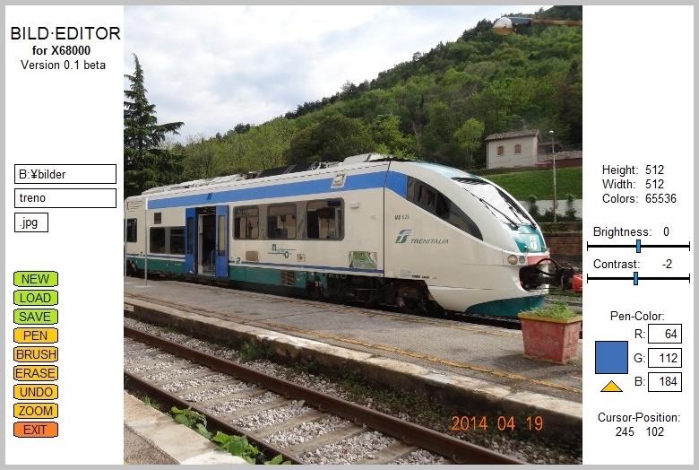 Et voilà: mein Bild-Editor mit 768x512-Pixel-Bildschirm, Mittelteil 512x512 Pixel mit 65536 Farben gleichzeitig, auf Original-X68000-Monitor.