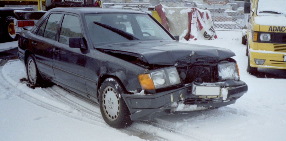 und so sah er nach dem Glatteis-Unfall 1993 aus.Unser schwarzer Mercedes 230E (Modell W124) von 1989 Obwohl ich ein Fan von weißen Autos bin, habe ich 1991 diesen blauschwarzen Mercedes gebraucht gekauft, da er alle Features hatte, die mir vorgeschwebt hatten und auch der Preis stimmte - so sah ich über die Farbe eben hinweg. Als ich jedoch anderthalb Jahre später in eine Glatteis-Massenkarambolage auf der Autobahn geriet und mehrere Teile ausgetauscht werden mussten, habe ich ihn dann bei dieser "Gelegenheit" gegen eine entsprechende Zuzahlung in einen alpinweißen Mercedes umlackieren lassen. |
