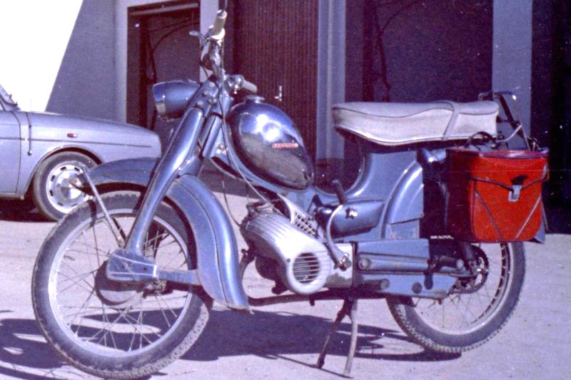 ![]() ![]() Unsere Zündapp Super Combinette (Modell 433) von 1964 Wenn man mit diesem Mokick mit Vollgas ein starkes Gefälle hinunterfuhr, passierte es manchmal, dass der Motor "überdrehte" und auf 50 km/h beschleunigte und danach auch ohne Gefälle noch kilometerweit in dieser Geschwindigkeit weiterfuhr - jedenfalls solange man nicht das Gas wegnahm oder bremste: in diesem Fall wurde sofort die Drosselung auf maximal 40 km/h wieder wirksam. An diesem Fahrzeug war eine Fahrradanhängerkupplung angebaut, die aber nur selten zum Einsatz kam, obwohl wir einen passenden Anhänger besaßen. |
